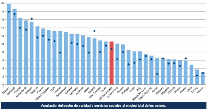 España se encuentra dos puntos por debajo de la media europea en proporción de empleo sanitario y de servicios sociales respecto al empleo total. Así, el sector de la salud en nuestro país aporta el 8,2 por ciento del total, mientras que la media de la OCDE se sitúa en el 10,2 por cien.