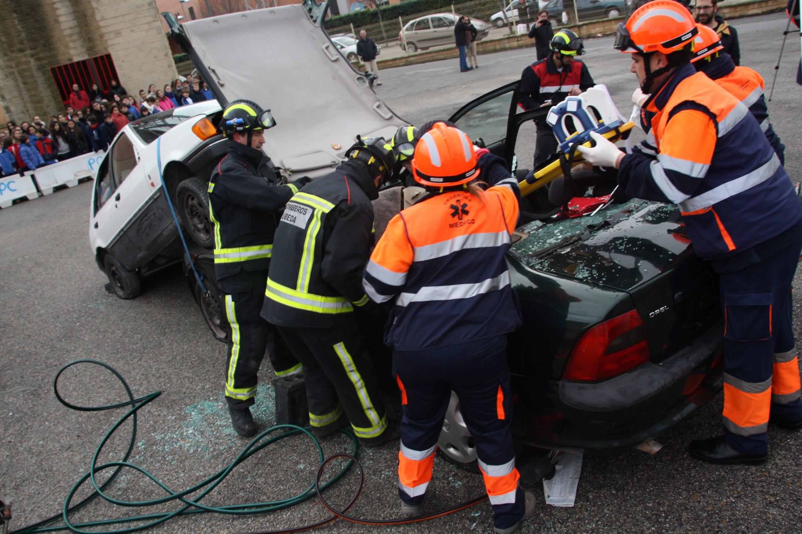 El simulacro tuvo lugar en las instalaciones de los Bomberos de Úbeda, y a él asistieron un centenar de estudiantes de 5º y 6º de primaria a los que se les explicó la necesidad del uso de los dispositivos de seguridad de los vehículos de transporte público y privado para salvar vidas.